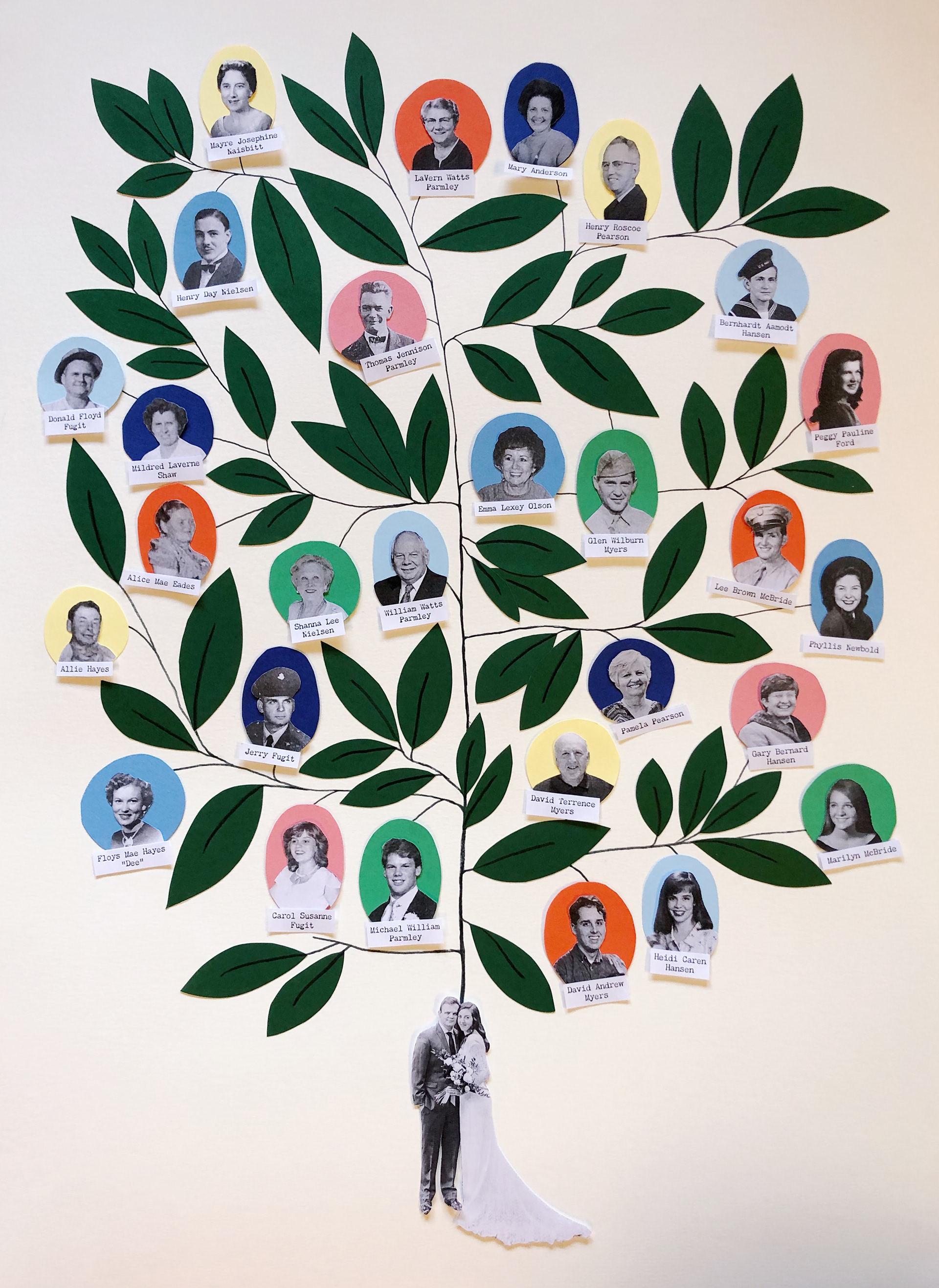 My family tree collage, going back to great-grandparents. I was inspired by French artist Maïssa Toulet and her arbres généalogiques series for this project.